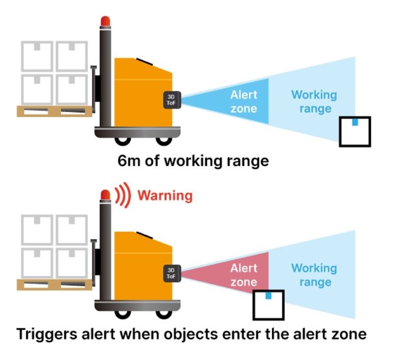 The Machine Vision Software DIAVision allows users to set the AGV/AMR alert zone within 6 meters of DMV-T’s working range, and the DMV-T supports dual signal output and event trigger setting for different hazard levels. When an object enters the alert zone, the software issues an alert and slows or stops the AGVs/AMRs to wait for operators to clear obstacles or adjust the path before resuming course.