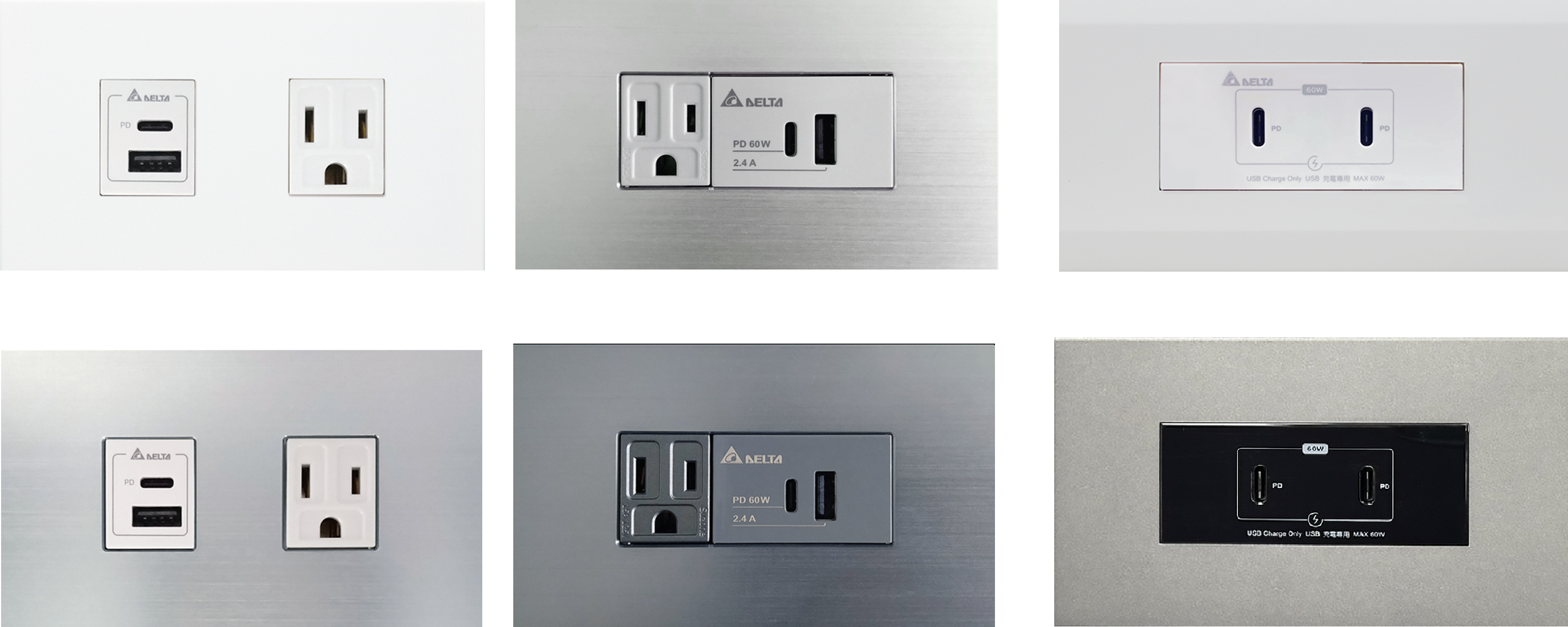 【Delta’s 60 W / 20 W USB Socket outlets provide max. 60 W / 20 W for a single Type-C port with up to 92% efficiency. They are available in several colors and feature modular design for users to flexibly match 1 or 2 AC sockets with USB ports or only USB ports.】