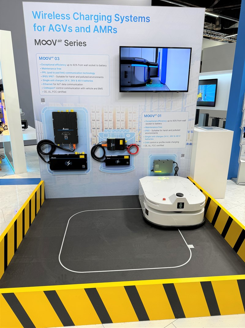 Delta continued to push the boundaries of autonomous electric vehicle charging with the M∞Vair Series wireless charging systems. The Series showcased its 1kW, 3.3kW, and 10kW models, all with a primary system for AC connection and an onboard system to charge vehicle batteries. The Series also features a gap of up to 150 mm compatibility with both lead-acid and lithium batteries, and 93% efficiency. The 1kW and 3.3kW models are ideal for AGVs and AMRs, while the 10kW model is tailored for high-power vehicles such as forklifts and ground support equipment.