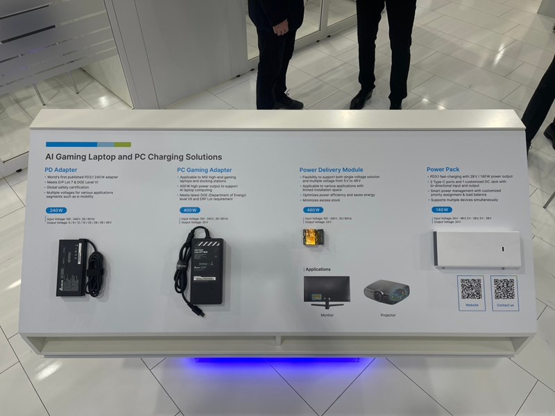 For the IT applications such as 5G telecom and base stations, Delta exhibited related DC-DC converters. The power modules support input voltages from 36V to 75V, with output voltages of 5V, 12V, 28V, and 50V, and output power up to 1,500W, achieving up to 96.9% efficiency. In addition, Delta showcased the high-end mobile power pack supporting PD3.1 fast charging. It features two Type-C ports, a custom DC port. Its capacity reaches up to 40,000mAh and the power output is 140W. With the IP67 ratings, the power pack is ideal for outdoor activities like hiking and camping, and can also serve as a backup power for IoT devices and base station receivers.