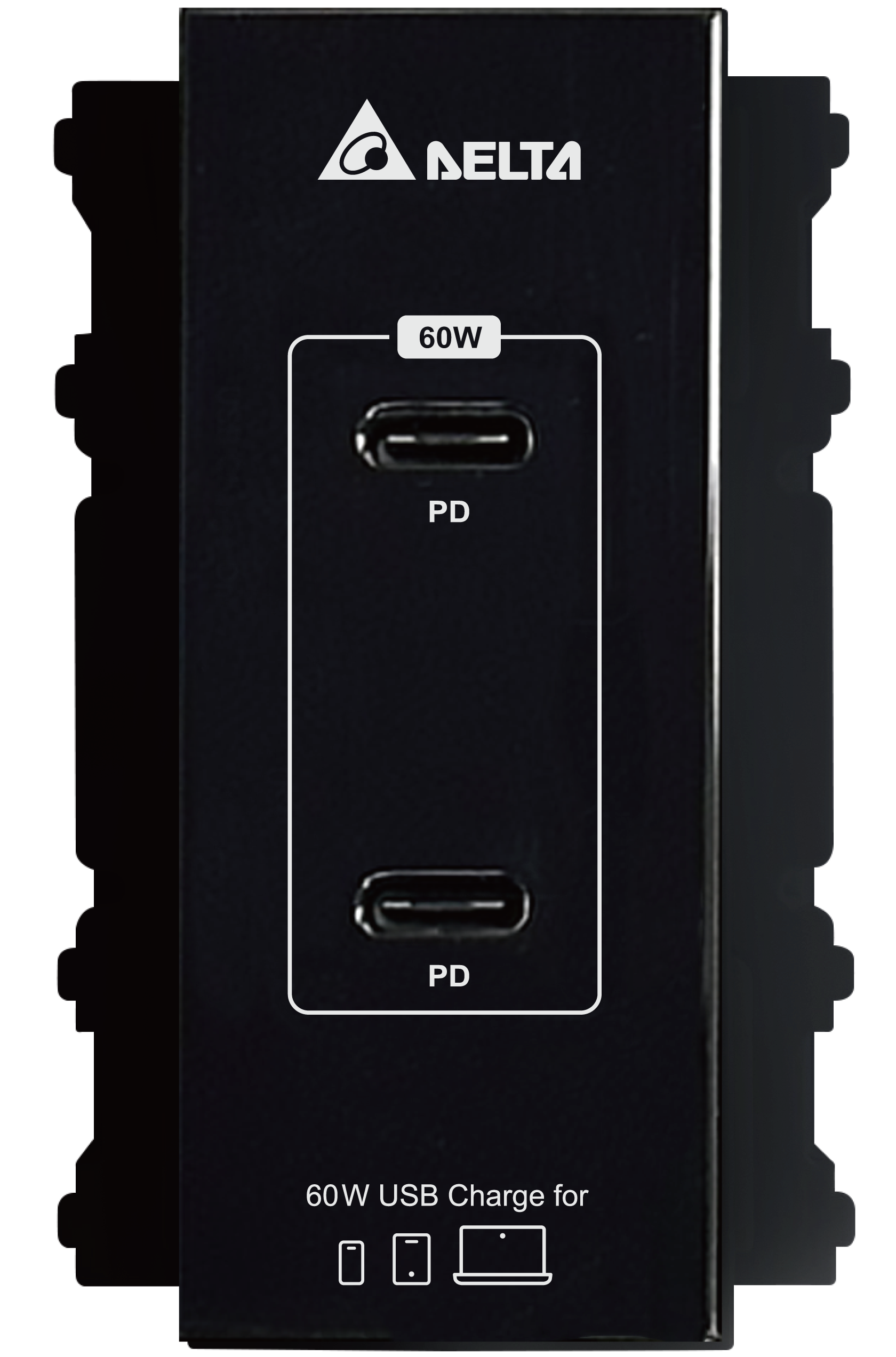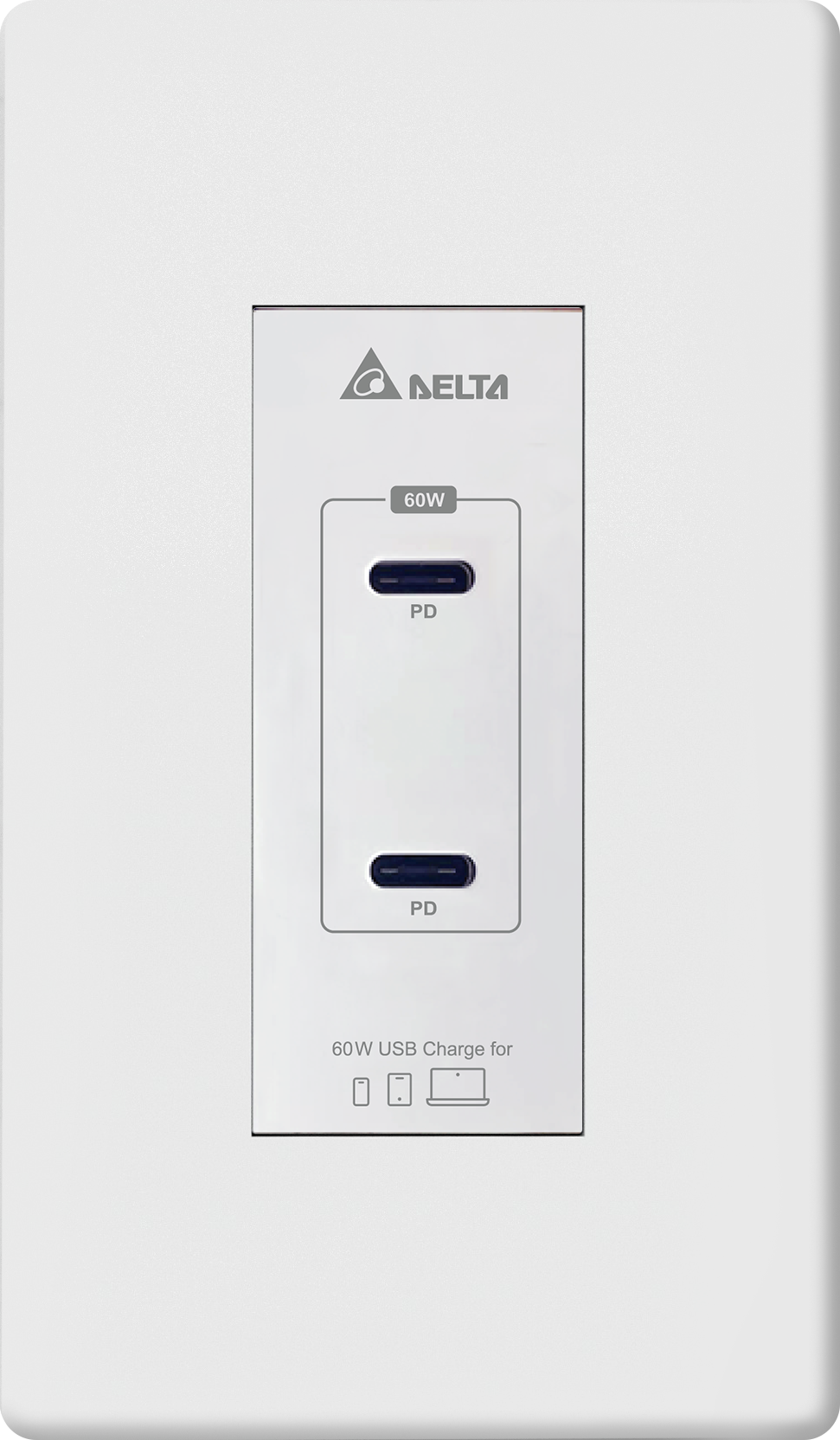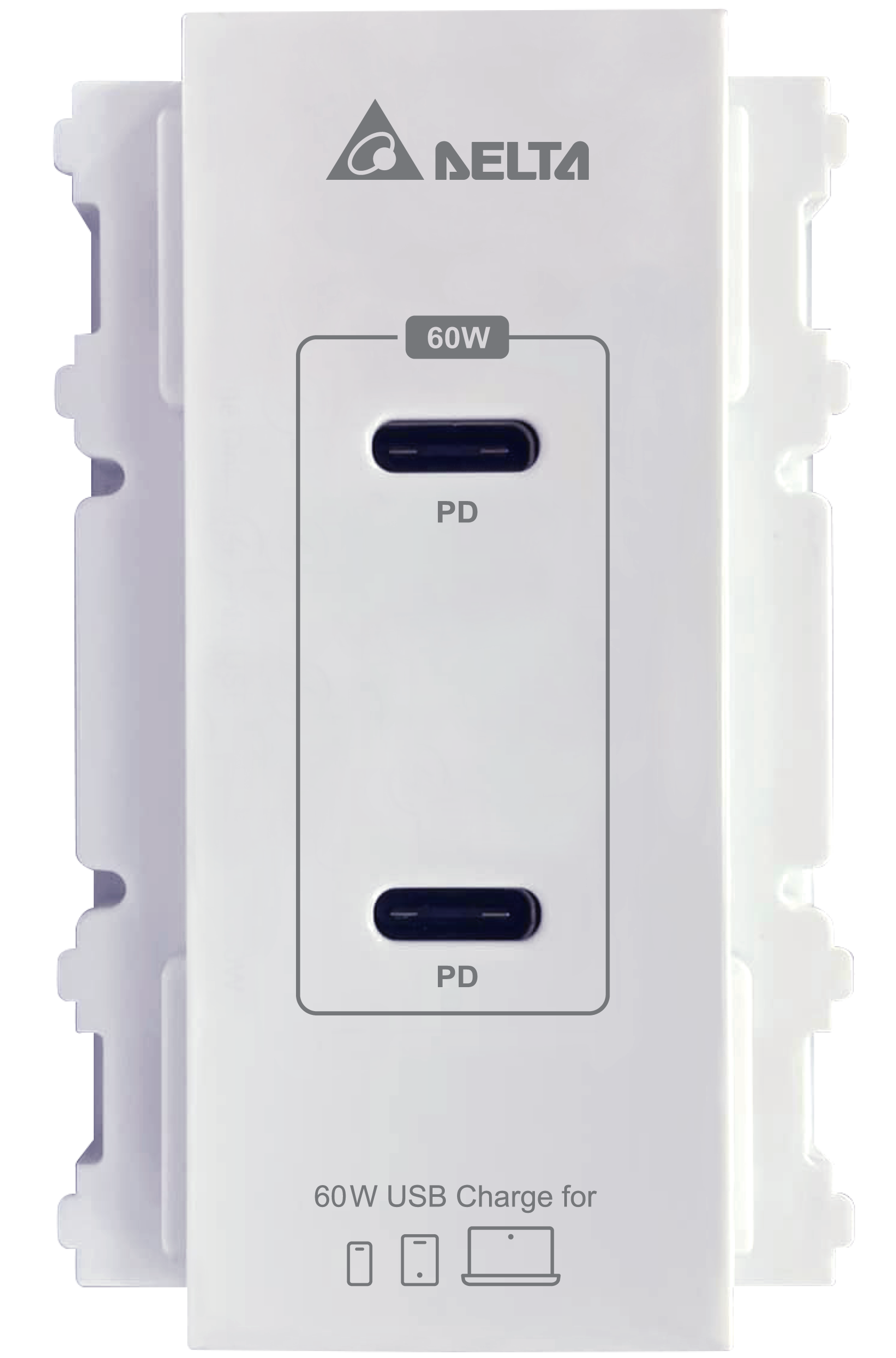 Delta's 60W USB C+C socket outlet serves as an outstanding charging station for all smartphones, laptops and other USB mobile devices. With an output power of up to 60W, it can charge a high-capacity iPhone 16 model from 0% to 50% in just 30 minutes. Easy to install and rigorously tested for safety and durability, it ensures every charge is safe, pleasant, and energy-efficient.