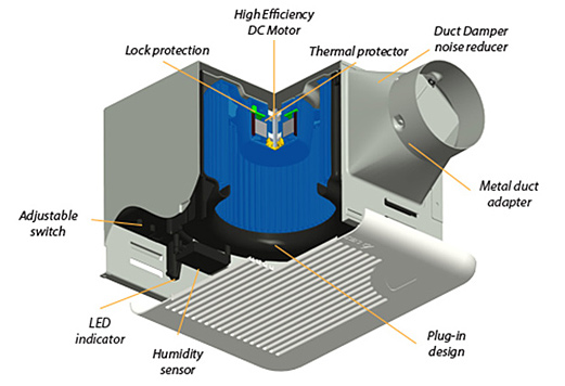 + Quiet – measured at the lowest noise level a bath fan has ever been certificated by HVI (Home Ventilation Institute)
