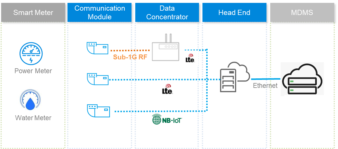 Specifically, NB-IoT and LTE are characterized by a distributed architecture, which makes these technologies suitable for use in scattered residential buildings (e.g., stand-alone houses), whereas Sub-1G RF is suitable for deployment in a centralized architecture (e.g., multi-dwelling units). The data concentrator compiles data, which is transmitted via LTE to the management system of power or water companies.