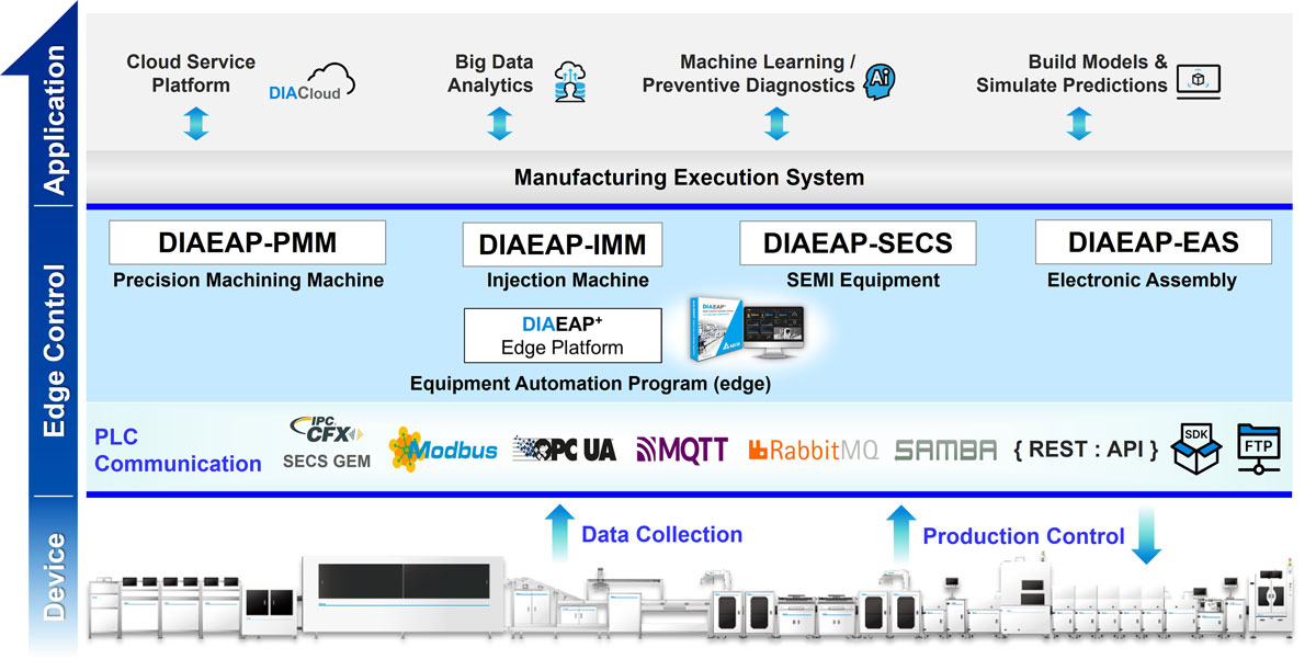 DIAEAP+ (Equipment Automation Program) provides an All-in-One integrated solution for device networking, compatible with various industrial communication protocols, and offering diverse methods for device data collection to enhance efficiency. It supports a flexible expansion framework and customized development. System integrators and developers can customize and deliver added value with software applications on the DIAEAP+ platform for specific needs.