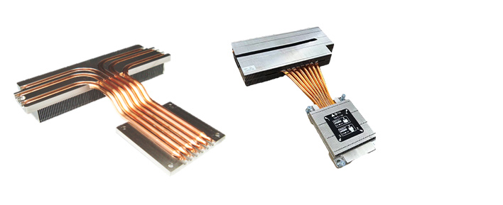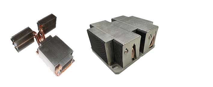Heat pipe is a heat-transfer device that employs phase transition, boiling & condensation process to transfer heat between two solid interfaces. With high heat transfer coefficients for boiling and condensation, heat pipe is extraordinarily effective thermal conductors. By bending and wiring heat pipes into heatsink, the heat source from chips can be carried out upward to higher local location of fin array with uniform temperature field, which benefits the enhancement of air-blowing cooling efficiency. Delta has profound design knowledge and experienced simulation techniques that help to pursue the most efficient heat pipe cooling solution.