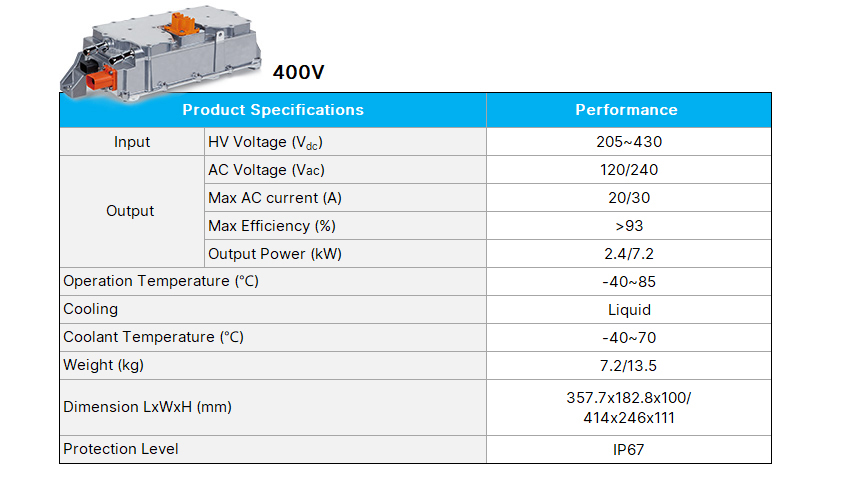 The on-board generator is a DC to AC Inverter. The DC high-voltage 400V/800V battery module converts AC 115V or 230V power through the on-board generator which can be used by external AC power devices.