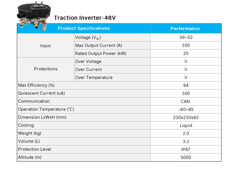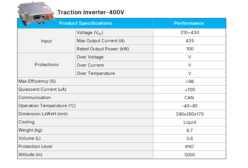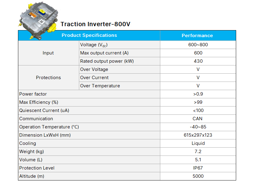Traction inverter is the motor drive in the electric vehicle. It converts the high DC voltage of the battery into a variable frequency and AC voltage to drive the motor. Its power flow is bidirectional and is adopted in BEV and PHEV. Output power ranges from 80kW to 400kW with efficiency greater than 98%.