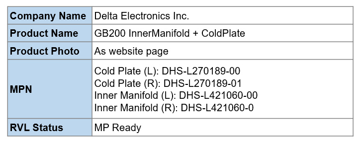 Delta has various cold plate for system power component like CPU, GPU, DIMMs and chips.