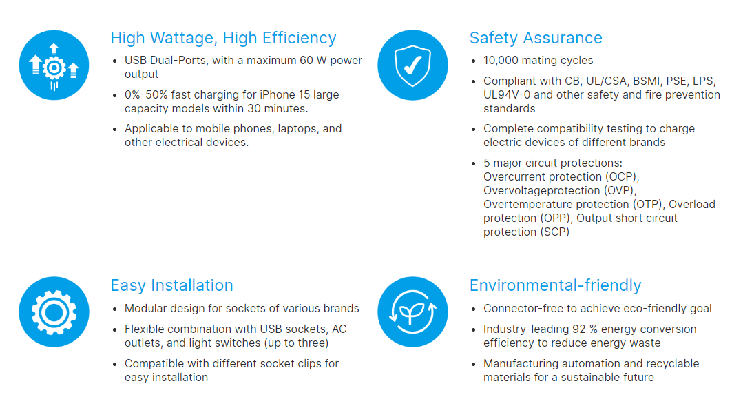 Delta's embedded USB Power Delivery (PD) charging wall sockets provide direct USB charging from the wall, eliminating the need for a separate charger. With a USB charging cable, mobile phones, tablets, laptops, and all USB devices can enjoy a fast and safe charging process. The PD wall sockets boast a high charging conversion efficiency of over 92% and utilize automated production and environmentally friendly materials to promote energy conservation and environmental protection.