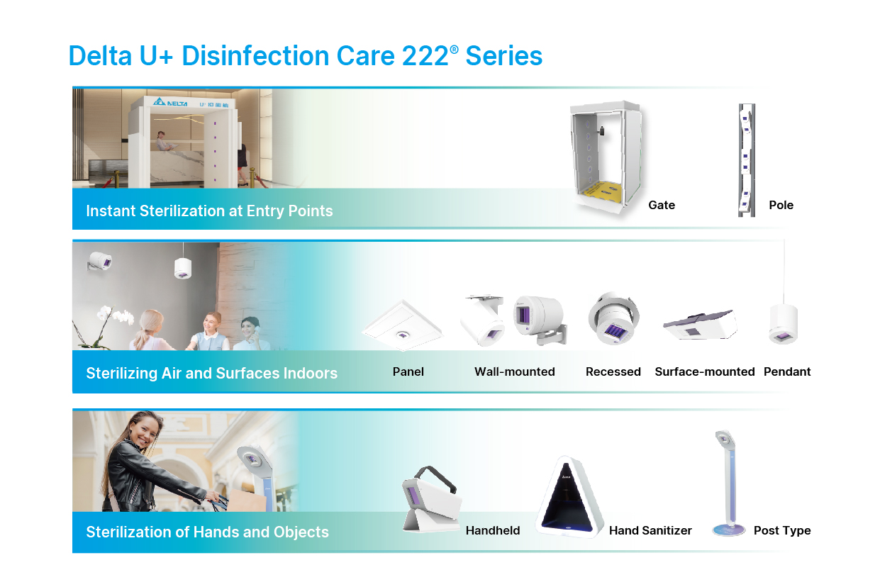 As we transition into a post-pandemic era where indoor mask mandates are being lifted, the paradigm of "proactive prevention" has emerged as a prevailing trend in enhancing indoor environments. Delta's U+ Antimicrobial Device, the Care 222® Series, represents a UV-based sterilization solution designed for safe human interaction, offering a versatile array of environmental disinfection protocols tailored to distinct contexts, thereby augmenting overall cleanliness and sanitary conditions.
